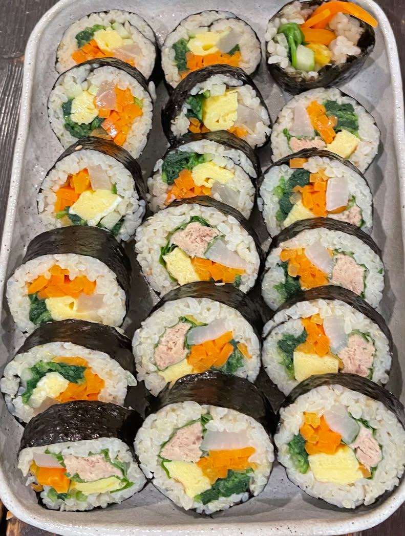 Gimbap – With variety of fillings; Danmuji (pickled radish), Wooeong jorim (braised burdock), carrots, spinach, mushroom, egg, tuna etc.